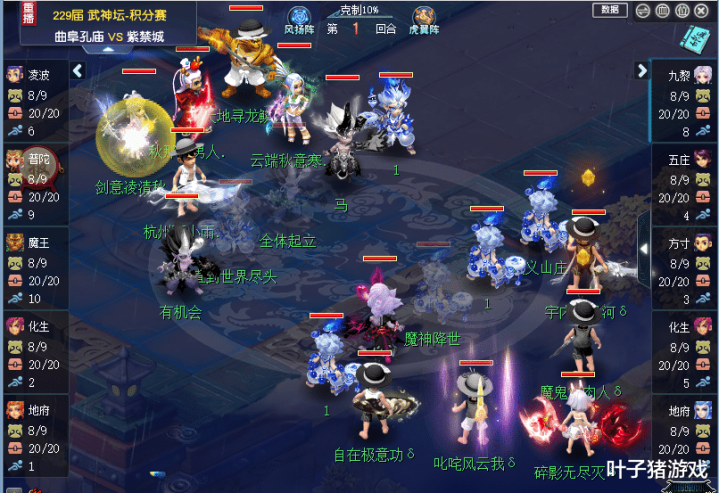 209届武神坛积分赛第四轮,曲阜孔庙虎阵四保一大克了紫禁城的风阵三攻,全场一速由紫禁城地府拿下,开场紫禁城点杀曲阜孔庙九黎,但是凌波被催眠没有点杀成功,次回合紫禁城错误估算了曲阜孔庙九黎血量百分比,换出一只超级鲲鹏却只击飞了曲阜孔庙一只宝宝,错失了先机。