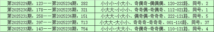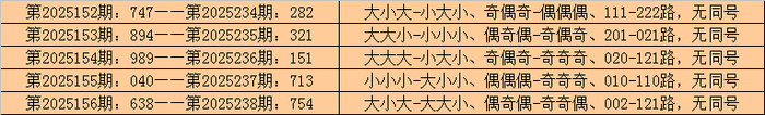 所以,排列三第2025157期奖号:250,与排列三第2025239期奖号可能没有同号。且排列三第2025239期奖号大小比、奇偶比和012路比不会与第2025157期奖号直选形态:小大小、偶奇偶和220路全部相同。