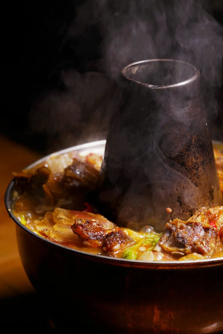藏式土火锅是以牦牛肉为主料的一种具有民族特色的火锅,人们更偏爱用牦牛骨现熬的清汤,直接把各种各样的菜堆放在锅里一起煮。