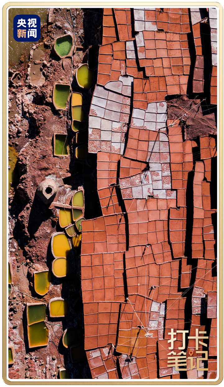 千年盐田倚崖而建,远远望去,仿佛一盘大地色眼影置于山间。