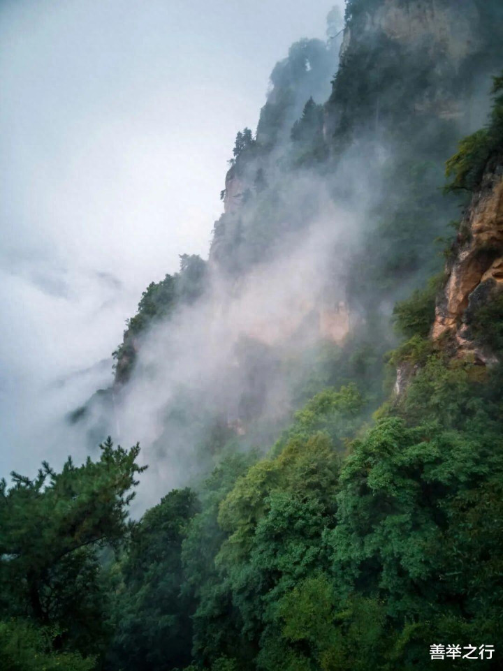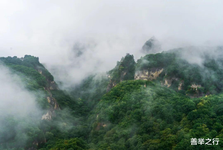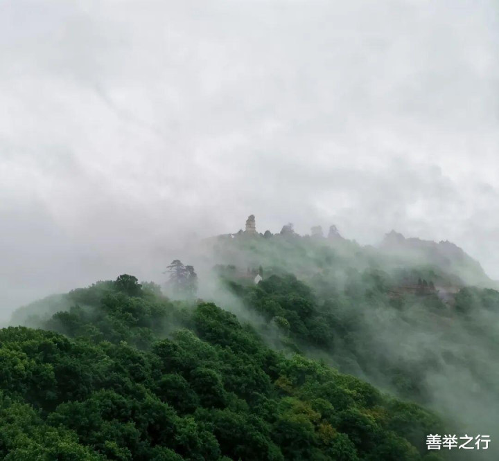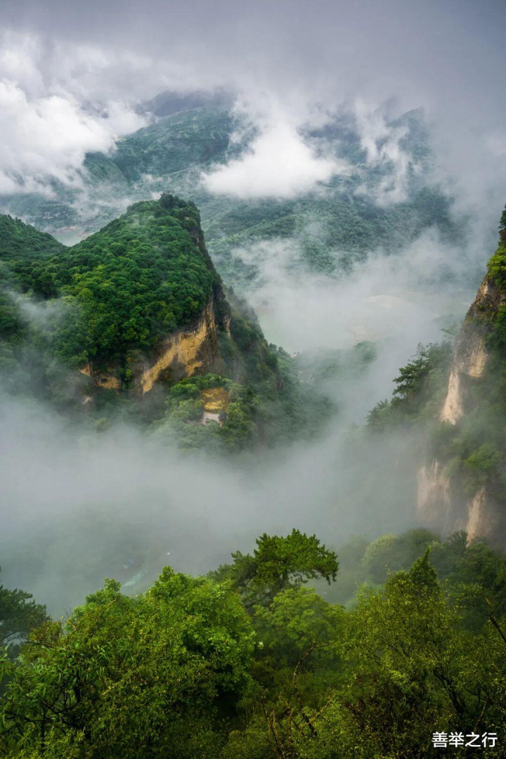 云自谷生,浩荡如海。群山化作岛屿,时隐时现,人行其间,也似在云中漫步。雾气偶尔散开,露出一角朱檐、半段石阶,旋即又合拢——恍如仙境,不肯轻易示人。