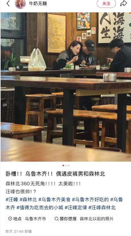 10月16日有网友晒出在新疆偶遇汪峰与森林北在一家小餐馆吃饭,从画面中能够看到,跟他们一起吃饭的还有一位男性朋友。