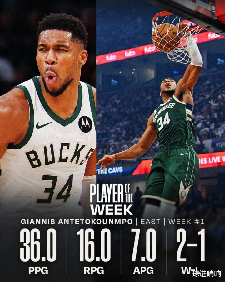 作为过去五年稳定的联盟前三级别超级巨星,本赛季字母哥依旧延续着攻防一体的炸裂表现,率领雄鹿队开季拿下2胜1负战绩,荣膺NBA第一周东部周最佳荣誉。
