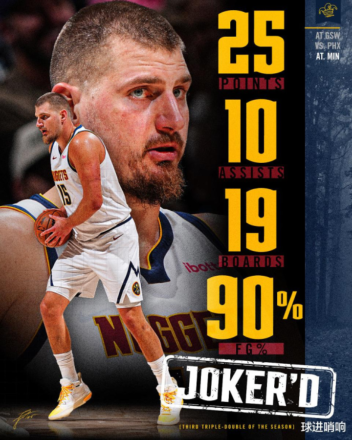 核心约基奇延续神奇表现,全场10投9中,高效砍下25分19篮板10助攻2抢断1盖帽三双数据,开季至今连续第三场交出三双表现。