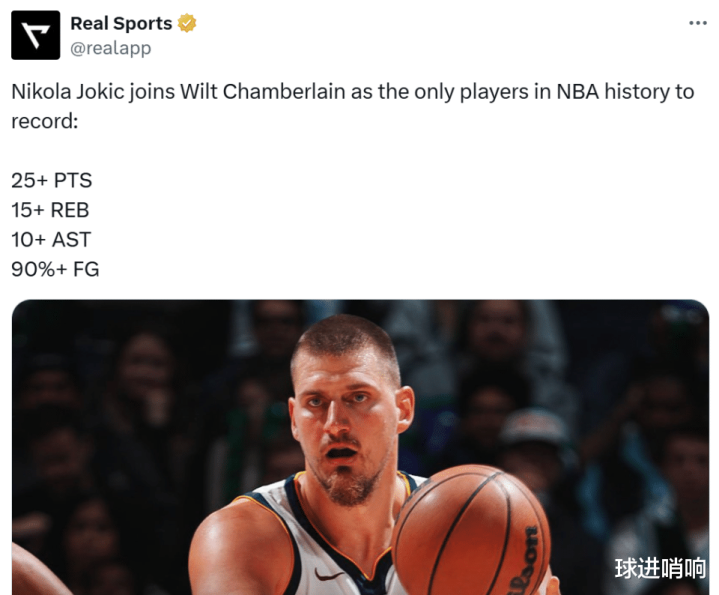 同时约基奇成为NBA历史上继张伯伦之后,第二位以至少90%命中率拿下至少25+15+10的球员。