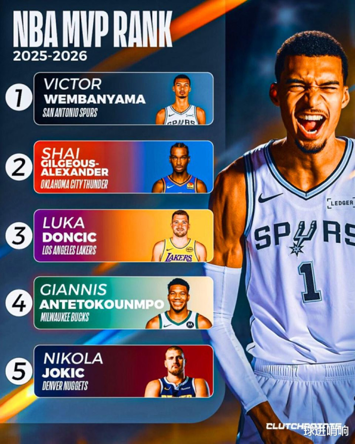结果开季至今表现如此夸张的约基奇,在美媒《clutchpoints》最新一期MVP榜单评选中仅排第五,前四名可谓是个个神仙。