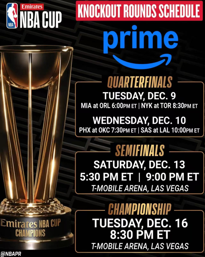 今日,NBA官方公布了NBA杯(原季中锦标赛)的淘汰赛赛程,具体安排情况为(均为北京时间):